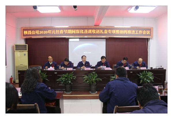 1月18日,核昌公司在公司大會議室召開了2020年元旦春節(jié)期間深化違規(guī)收送禮金專項整治再推進(jìn)工作會,專題部署了公司下一步的專項整治工作,公司領(lǐng)導(dǎo)班子成員、全體中層干部參加了會議...