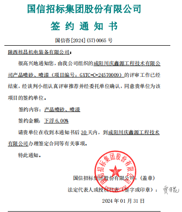 2024年1月31日,國信招標集團股份有限公司發(fā)來簽約通知書,陜西核昌機電裝備有限公司成功中標產(chǎn)品噴砂噴漆項目。自項目發(fā)布招標公告以來,核昌公司領導高度重視項目招投標工作,認真...