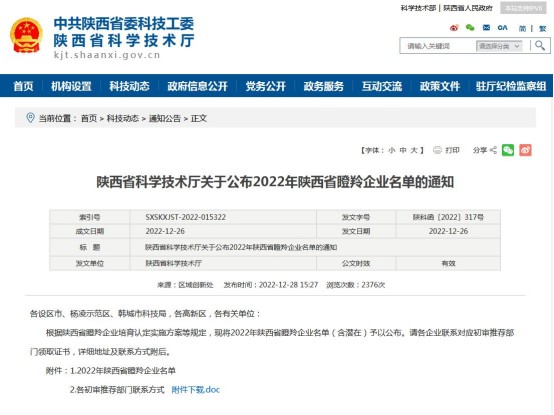 日前,陜西省科學技術(shù)廳公布了《陜西省科學技術(shù)廳關(guān)于公布2022年陜西省瞪羚企業(yè)名單的通知》(陜科函〔2022〕317號),根據(jù)陜西省瞪羚企業(yè)培育認定實施方案等規(guī)定,經(jīng)屬地推薦、第三...