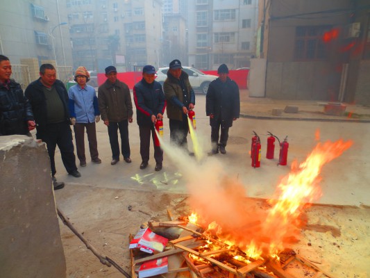 春節(jié)將至,為確保210小區(qū)的安全,咸陽二一零物業(yè)管理有限責(zé)任公司,于2015年2月6日在小區(qū)組織了一場消防滅火演練,許多小區(qū)業(yè)主現(xiàn)場進(jìn)行了觀摩。上午8:50在12#樓前空地處,由小區(qū)安全員孟貴山同志就滅火器的構(gòu)成、作用及怎樣使用滅火器等相關(guān)知識講解并現(xiàn)場示范。事前物業(yè)公司對消防演練進(jìn)行了周詳?shù)陌才牛阂髤⒓友菥毜乃腥藛T聽從安排,服從指揮,讓每個職工親身實踐正確使用滅火器滅火。參加的人員包括門衛(wèi)、車棚、巡邏、保潔等各部門的員工。9:00,點火人員點燃了熊熊烈火,消防滅火演練人員3人一組,分為3個組,第一組人員提著滅火器沖到離火焰約2米處對準(zhǔn)熊熊烈火的根部進(jìn)行高壓噴射,火勢迅速被控制,后面兩組依次輪流進(jìn)行滅火演練,最后火焰被徹底熄滅了。整個過程緊張有序,取得了較好的效果,受到在場業(yè)主的一致好評。通過本次消防演練,進(jìn)一步增強了小區(qū)住戶的安全防范意識、完善了消防預(yù)案、提高了消防應(yīng)急救援水平。