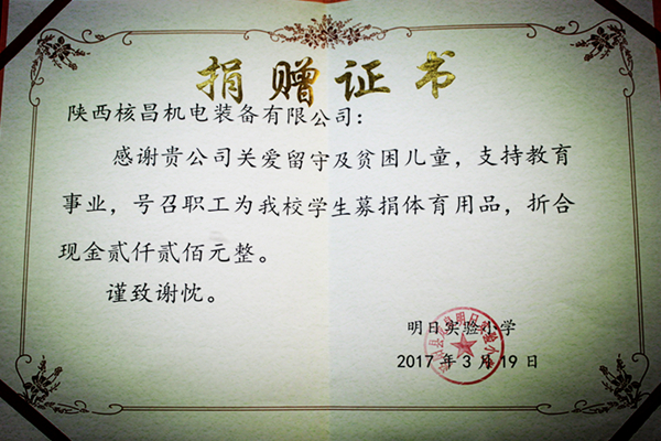 “傾心公益,傳遞愛心”,多年來,核昌公司干部職工一直熱心于公益事業(yè),主動(dòng)發(fā)揚(yáng)雷鋒精神。此次,核昌公司團(tuán)委通過組織職工為留守兒童募捐,希望在校學(xué)生提高鍛煉身體的意識(shí),幫助他們健康成長。受捐學(xué)校舉行了捐贈(zèng)儀式,表達(dá)了對(duì)核昌公司職工的感激之情,并為公司贈(zèng)予了榮譽(yù)證書。