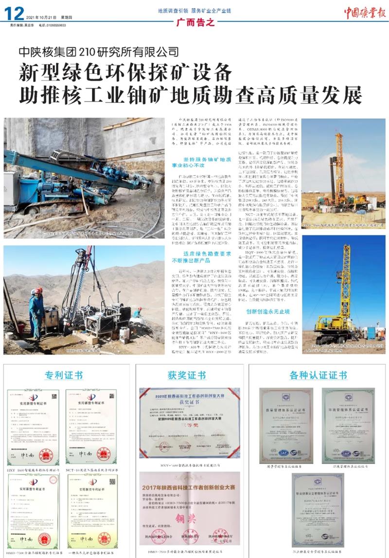 適應(yīng)綠色勘查要求不斷推出新產(chǎn)品。近年來,中陜核210研究所將生態(tài)文明、綠色勘查建設(shè)貫穿于企業(yè)發(fā)展的始終,加大產(chǎn)學(xué)研結(jié)合力度,積極與中國地質(zhì)大學(xué)、中國礦業(yè)大學(xué)等高等院校進行合作,在產(chǎn)品創(chuàng)新創(chuàng)造、技術(shù)研發(fā)、質(zhì)量提升方面不斷推陳出新,形成了自主專利的鈾礦地質(zhì)鉆探車載機組、綠色勘查泥漿不落地系統(tǒng)、便攜式全液壓巖心鉆機、新能源環(huán)衛(wèi)車、高速精密主軸等產(chǎn)品鏈,走出了一條自主創(chuàng)新、開發(fā)、制造和應(yīng)用的高新技術(shù)企業(yè)發(fā)展之路。公司目前擁有2項發(fā)明專利、42項實用新型專利,公司“HMD-7500多功能全液壓錨固鉆機項目”“HXY-1600智能拖車鉆機項目”等產(chǎn)品分別榮獲陜西省科技工作者創(chuàng)新創(chuàng)業(yè)大賽三等獎。