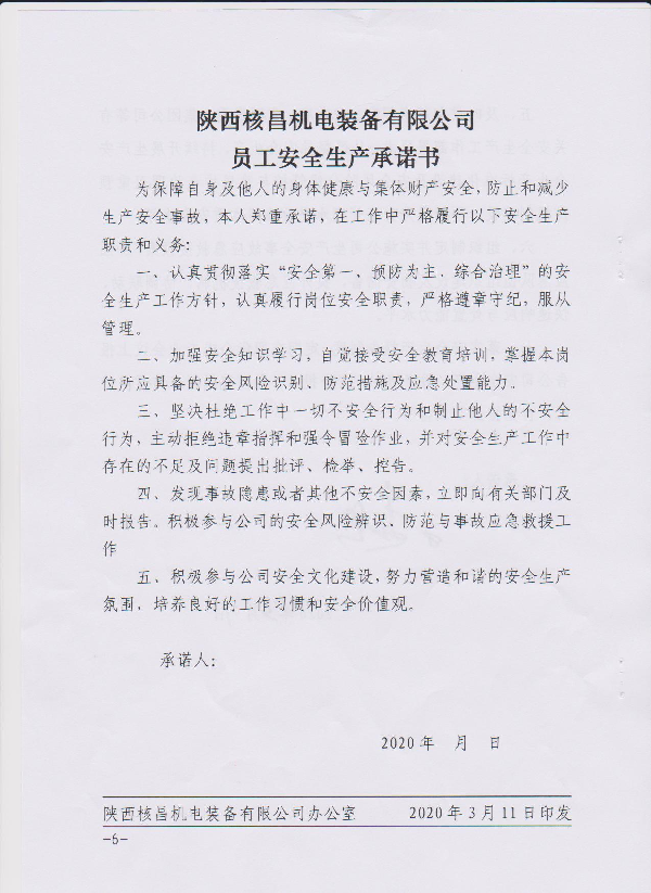 陜西核昌機電裝備有限公司關(guān)于印發(fā)安全生產(chǎn)承諾的通知